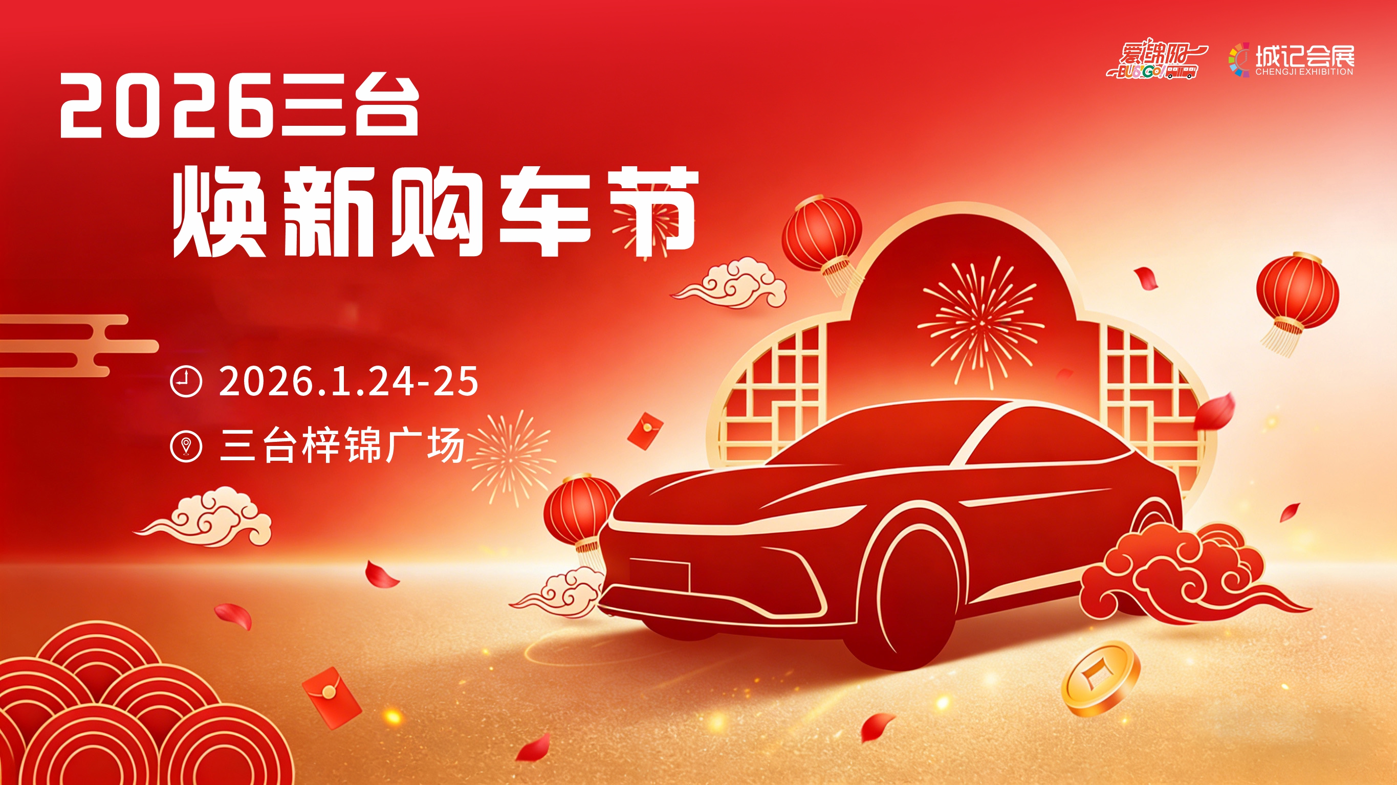 1月24日-25日,三台县梓锦广场,热门车型集结、多重好礼相赠,诚邀三台市民及返乡乡亲光临现场,选心仪座驾、置新春好礼,共赴这场新春汽车消费盛会!